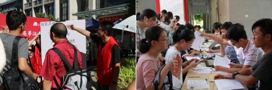 2018年8月29日,800余名18级本科、硕士、博士新生怀揣着青春梦想迈进1946伟德国际源自英国的大门,参加入学报到仪式,佩戴不同颜色和图案的班级纪念徽章,并与家长在“签名墙”前合影留念,随后在食品楼大厅正式报到。