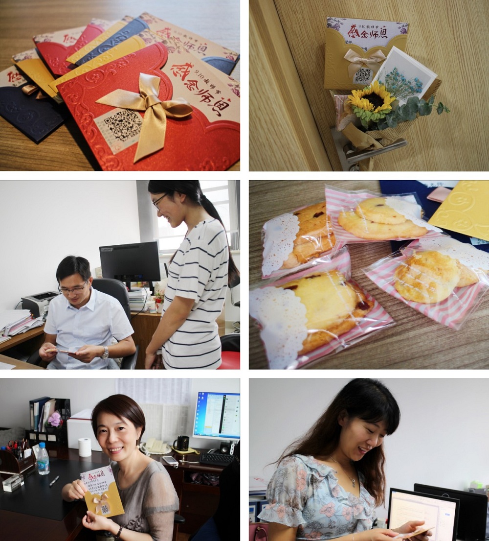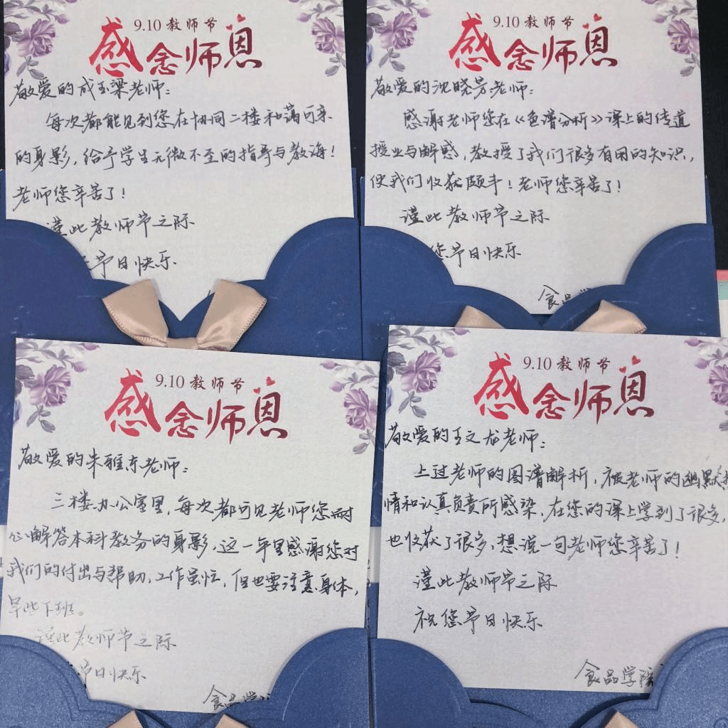 另外,教师节前后,学院还倡导同学们通过上课起立致敬老师、献花老师、发送祝福语等多种形式,向教师们表达节日祝贺。通过一系列活动的开展,食品学子表达了对老师们的敬仰和感激,加强了师生的情感沟通,增进师生友谊,营造了尊师重教的良好氛围。
