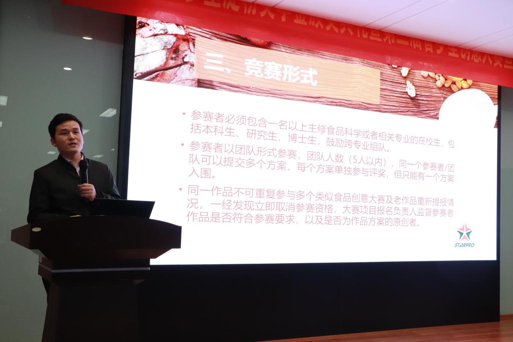 曾令军先生为大家详细介绍了企业概况及第三届普罗星淀粉创意大赛的比赛规则,同时讲解了十几种淀粉的应用特性、适用产品,让大家对本次淀粉创意比赛有了更深入的了解。第二届普罗星淀粉创意大赛获奖代表刘思宇同学发言,她结合参赛经历给在座学生提出建议,她表示,选题是关键,创新是前提,合作是基础,鼓励在座同学积极报名参赛。在答疑环节,主办方针对同学提出的问题作了专业详细解答。