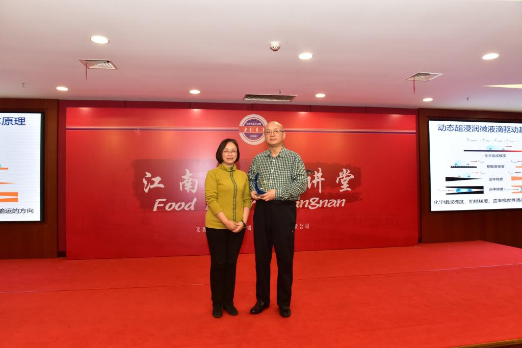 在整场讲座中,江院士融知识与哲理于一体,逻辑清晰,旁征博引,慧语迭出,幽默风趣,为江南师生带来了一场启迪心智的科学探索之旅,分享了自己基于仿生原理建立和发展的超浸润界面科学体系的科研创新和人生思考,让在场观众见识到一位真正的学者风范,其广博的学识、独特的人格魅力、丰硕的科研成就深深感染了在场每一名观众。讲座结束后,江院士还与现场师生共同探讨学术问题,耐心解答师生提问,气氛活跃,反响热烈。在活动最后,1946伟德国际源自英国党委书记向琪为江院士颁发了“江南食品大讲堂演讲纪念杯”。