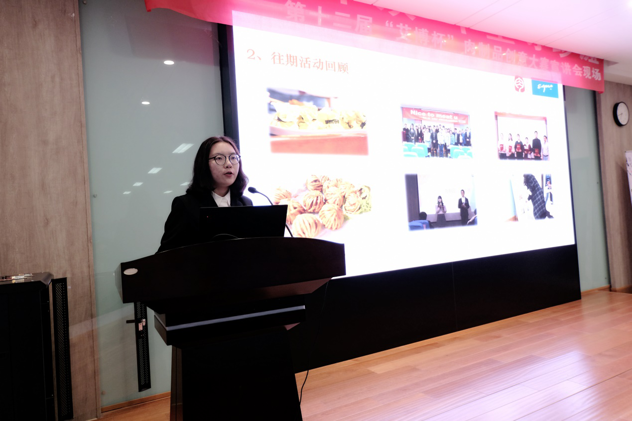 胡晓丹老师介绍了嘉兴艾博实业有限公司的基本情况及发展历程。肉制品俱乐部高露露同学介绍了本次的竞赛规则,对活动目的、产品要求、竞赛要求、奖励设置等进行了讲解,使同学对比赛有了初步的了解。在互动提问环节,同学们踊跃提问,肉制品俱乐部主席章金怡同学一一耐心解答,并向同学们赠送了精美的礼品,现场氛围十分热烈。最后,肉制品俱乐部公布了策划书投递邮箱及比赛QQ群,鼓励同学积极参加,踊跃报名,在比赛中勇于创新,争取创造佳绩。