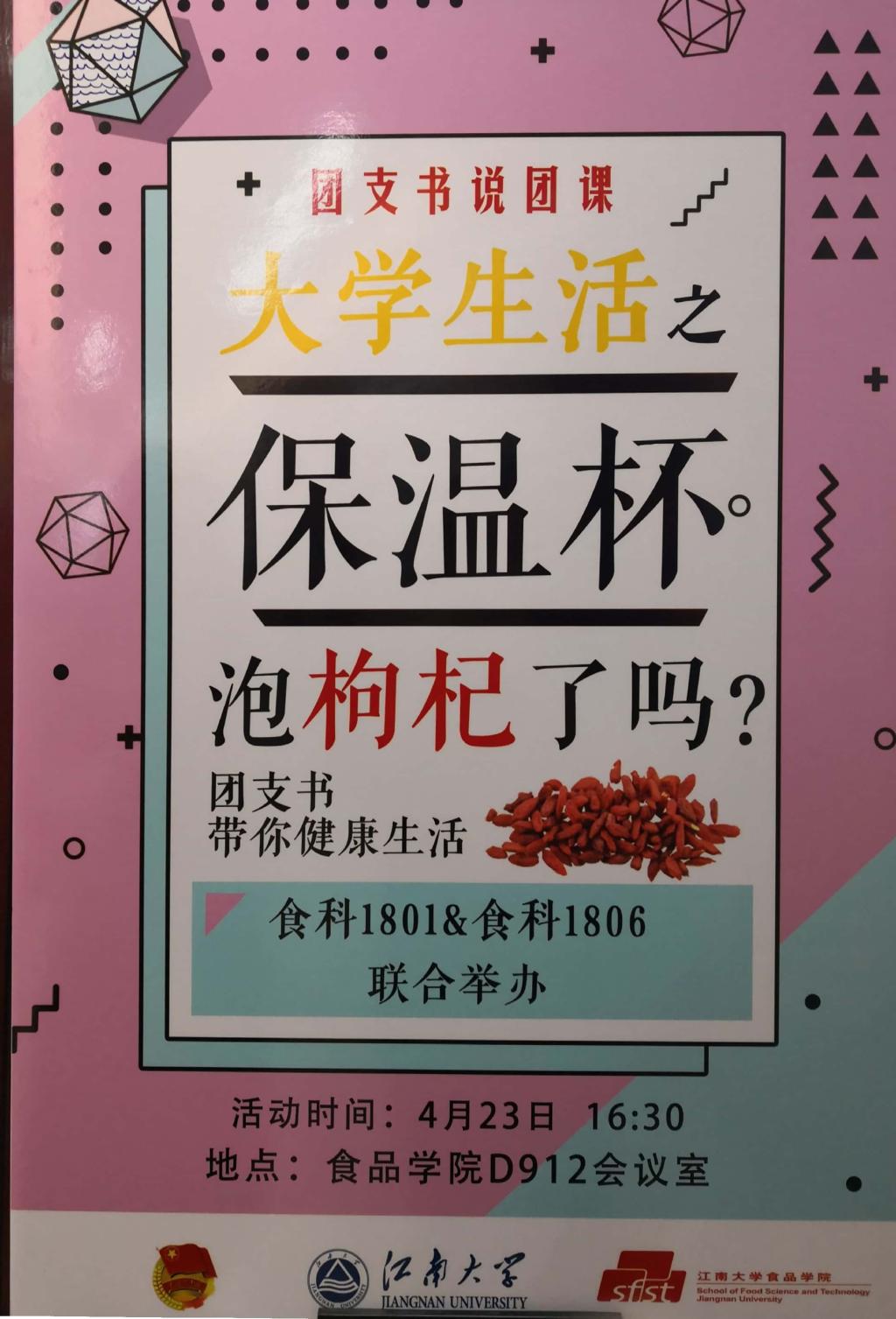 4月23日下午16:30,由食科1801和食科1806团支部联合主办的“团支书说团课”系列活动第四期在食品楼D912如期举行。本次活动以“健康生活之保温杯里泡枸杞”为主题,邀请到1946伟德国际源自英国分团委书记王胤老师,食科1806班班主任杨方老师,18级辅导员吴爽老师及食质1602班鲁晨辉出席,活动由1806班团支书彭楚翘主讲。