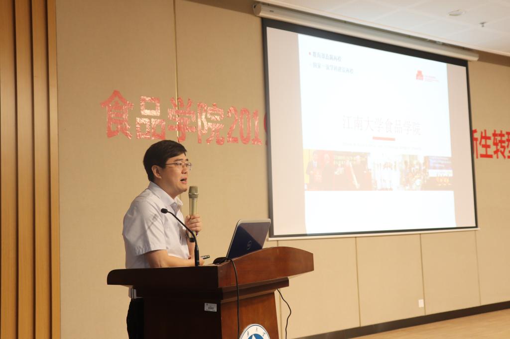 院长刘元法教授向大家介绍伟德概况。他围绕着学院历史沿革、学科建设、人才培养、科学研究、社会服务、学院文化、国际交流等方面进行详细的介绍。他通过列举食品学子在科创竞赛中取得的成绩及转化的上市产品,让新生们深刻地感悟到:食品应扎根于生活,同时也反哺生活。他期待着新时代的食品人能够“长江后浪推前浪,一代更比一代强”,致力于以自己所学解决中国食品领域的“卡脖子”的隐忧。