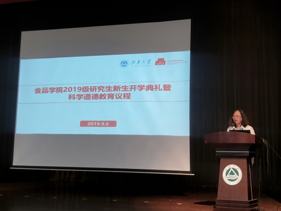 会议伊始,向琪书记为开学典礼致辞。首先,向琪对新同学的到来表示热烈欢迎。她指出,全体2019级研究生新生要胸怀祖国、志存高远;其次,海纳百川、求同存异;最后,潜心科研、脚踏实地。希望同学们在新时代的伟大实践中作出新一代江南食品人的新作为。