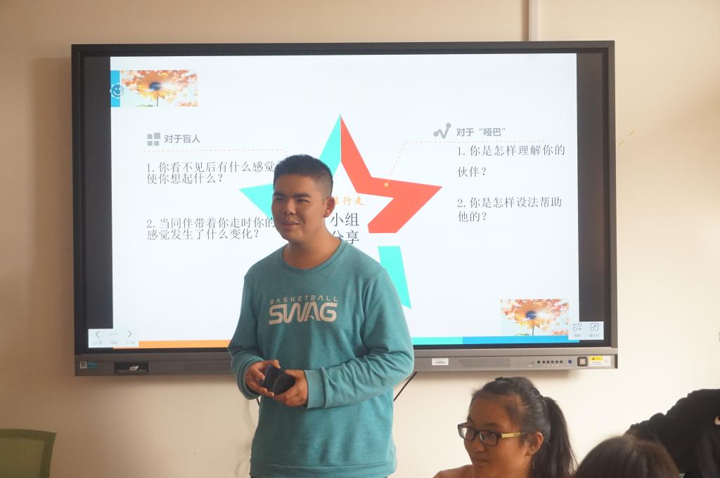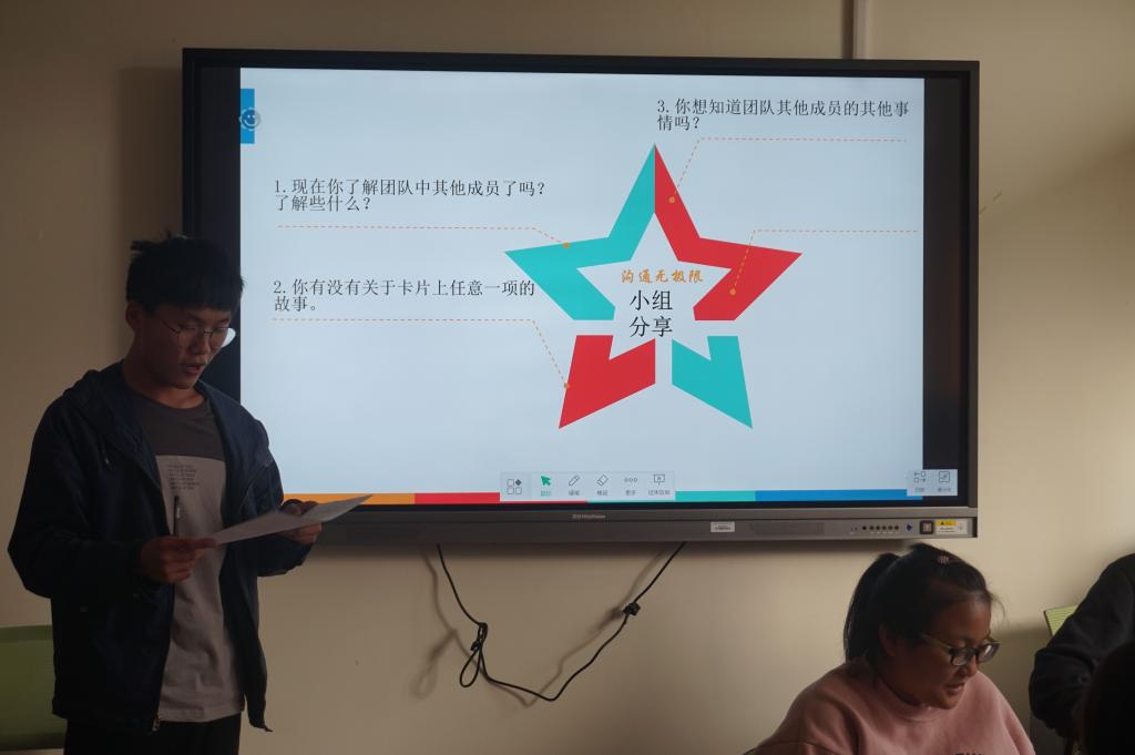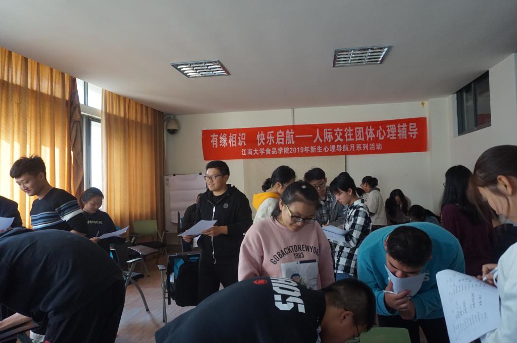 活动伊始,陈华平老师介绍了人际交往对于大学生的重要性。随后,他将现场同学被分为四组,每组由一位老师带领开展活动。团辅活动分为四个环节,第一个环节名为“相见欢”,老师通过“大风吹”的小游戏,引导全组同学轮流进行自我介绍,在短时间内活跃了活动气氛,增进彼此了解。第二个环节是“信任行走”,让现场同学体验“盲人”和“哑巴”角色,互相扶持走过有障碍物的道路,建立起了对彼此的信任。第三个环节是“沟通无极限”,每人收到一张空白的寻人信息卡,请小组内外符合信息卡上特征的同学签名,大家在寻找的过程中发现与自己有共同爱好的同学,活动现场笑声不断。收尾环节是“写祝福语”,现场师生传递卡片,写下通过活动相识后对彼此的祝福,寄语未来精彩美好的大学生活。