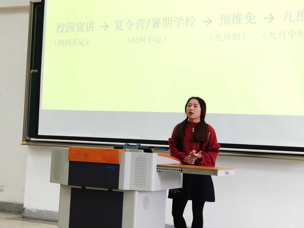 接着是由食科1605班潘雨琦、食科1603班章金怡进行的保研经验分享。潘雨琦向大家提出了“你离毕业有多远”、“你离考研有多近”两个问题。她分享了自己和室友的经历,向同学们介绍了获得本校推免资格的基本要求,同时给予同学们要修满学分、抽出时间学好英语、学好专业课以及要尽早了解考研基础信息四点建议。成功保研到复旦大学生命科学院的章金怡从自己的科研经历、竞赛获奖以及游学经历等方面进行了展示。她认为游学经历可以开阔视野、增加阅历,科研经历在学习生活中也是十分重要的,同时鼓励同学们走出宿舍,积极参加各类比赛项目和校内活动,并为同学们介绍了保研需要做的准备流程和重要的时间节点。