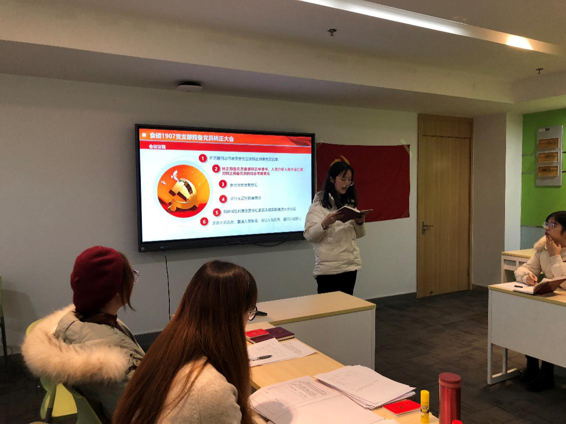 本次会议包括“十九届四中全会系列讲话解读”主题微党课、食硕1907党支部预备党员转正大会、“不忘初心、牢记使命”主题教育民主评议三个部分。微党课上,李艳敏同志带领大家了解了全会概况及会议公报,学习了《决定》的具体内容,并对70周年系列讲话进行了解读。随后,党支书李琳老师对学习内容进行了补充和总结。