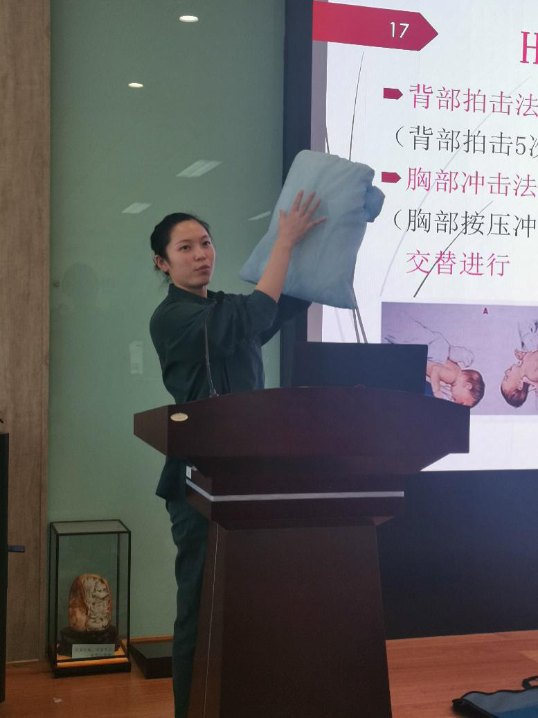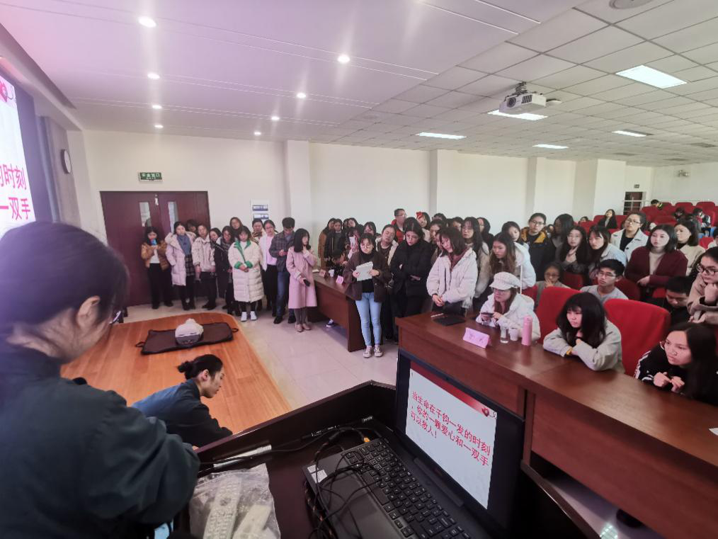 本次讲座主题分为“气道异物处理”和“心肺复苏”知识普及与答疑解惑两个环节。首先,李青玲护师通过列举几个因急救知识不足而酿成的悲剧,阐述了掌握急救能力的重要性。接着通过PPT讲解,她与陆萍护师相继普及了关于成人及婴幼儿气道异物急救、心肺复苏的相关知识,阐明了心肺复苏的要点,纠正了同学们对心肺复苏认知的误区并亲身示范了相关操作与技巧。