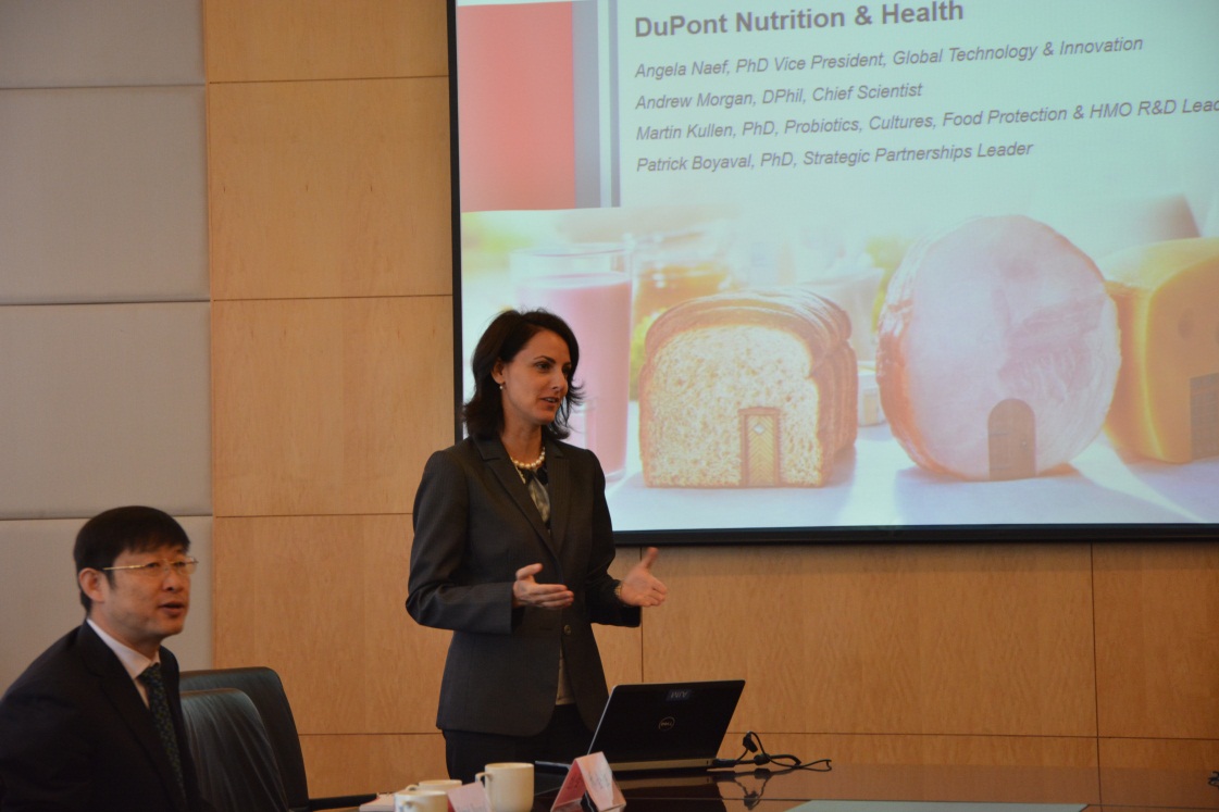 会上,顾正彪副校长对杜邦团队一行的到访表示热烈欢迎,他回顾了杜邦公司与我校的合作历史与取得的成果,并就学校概况和未来发展重心做了介绍,同时也就双方谋划共建相关合作事宜提出建议。刘元法院长介绍了1946伟德国际源自英国的发展情况和优势资源,并表达了学院与杜邦公司开展深入科技合作的愿望。Angela副总裁介绍了杜邦营养与健康事业部的核心价值观,同时也与食品生物技术中心的张灏、赵建新教授等探讨了在益生菌功能食品开发与应用领域的学术问题及双方的合作模式。