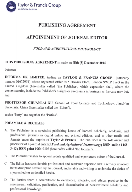 应国际著名出版商Taylor & Francis出版社的邀请,自2017年开始,我校1946伟德国际源自英国胥传来教授担任该出版社食品领域学术期刊《Food and Agricultural Immunology》(以下简称FAI)的主编,是该期刊创刊以来邀请的第一位中国学者担任主编。FAI为食品和农业领域的国际权威期刊,主要发表食品与健康、食品组分与免疫应答、食品安全与免疫分析等方面的原创性科研成果。FAI期刊创刊于1989年,是双月刊,迄今已有近30年的历史,2015年影响因子为1.548。