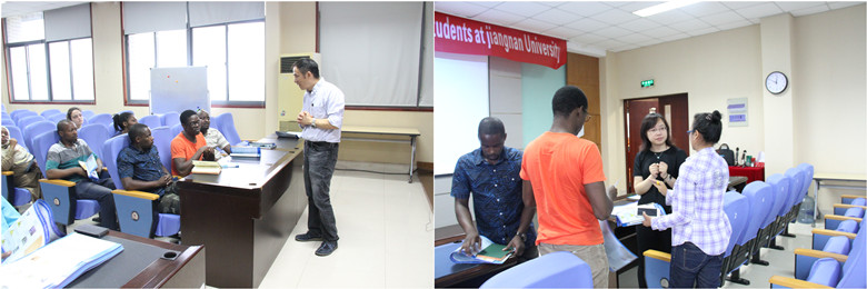 顾震南教授(左)、谢云飞主任(右)与留学生交流