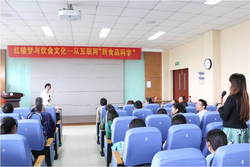 随后,在同学们热烈的掌声下,罗燕老师开始了她的红楼梦分享。首先,罗燕老师讲述了自己从一名财务工作者,因为偶然的机遇和红楼梦结下了不解之缘,她用自己丰富的人生阅历跟我们诠释了她眼中的红楼梦,意味深长。随后罗燕老师为同学们解读红楼梦三十七,三十八两回,从大观园螃蟹宴再到饮酒赋诗,罗老师通过专业的朗诵和独到的个人见解为同学们描述了红楼梦中每个人物的性格特征,生动形象;同时她以螃蟹为引,讲述了红楼梦中饮食文化的特点并与现代社会饮食习惯做了比较。她表示我国传统文化博大精深,饮食文化几乎是其中最重要的环节,在互联网的时代,互联网可以无限延伸,所以有了互联网+的说法,食品文化也可以无限延伸,她跟我们生活的方方面面都有着无限的联系,所以,她提出了食品科学+的概念。最后,同学们和罗燕老师进行了互动,现场气氛十分活跃,罗燕老师用自己丰富的人生阅历,跟同学们分享了自己对生活的感悟,同学们都表示讲座很精彩,受益匪浅。
