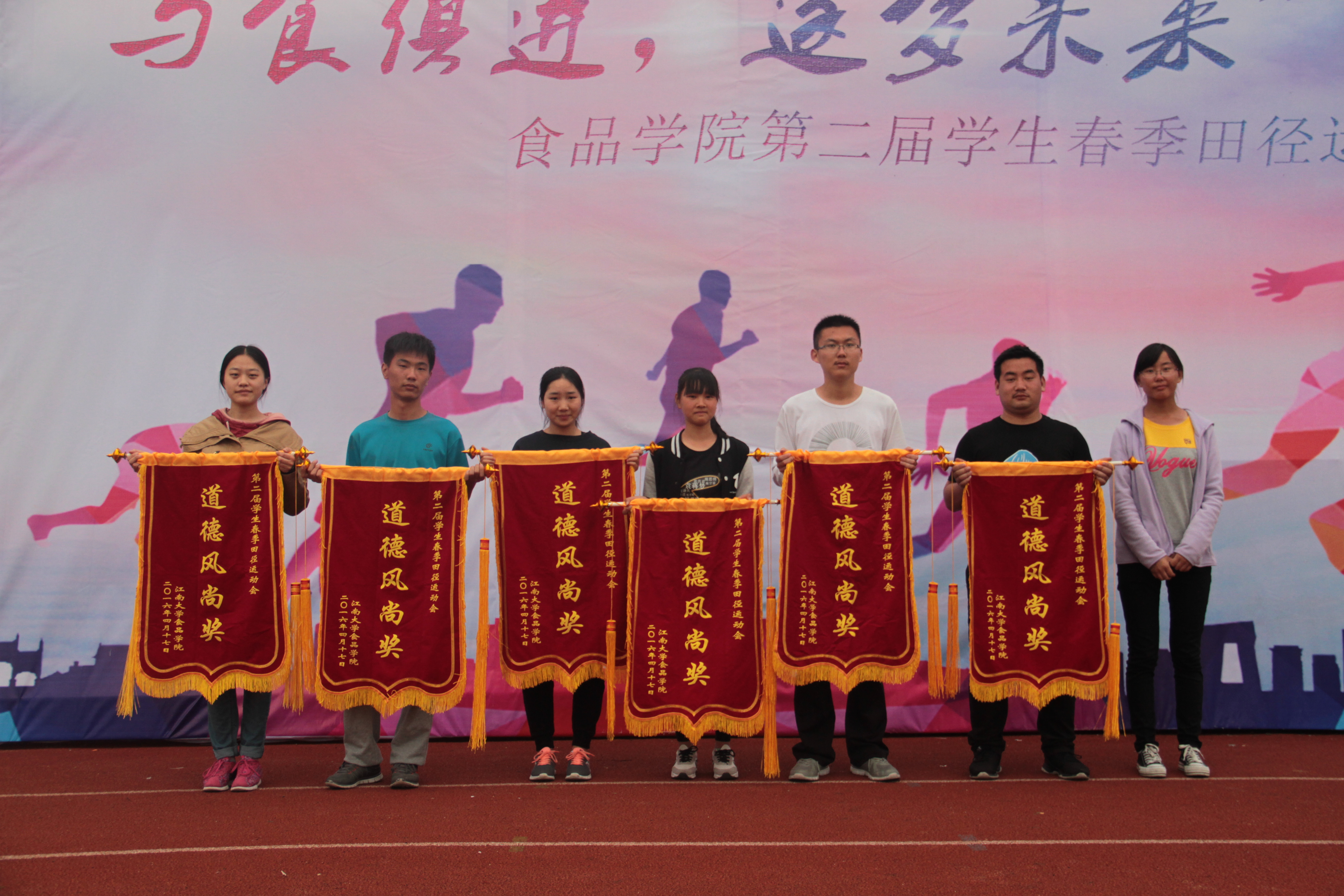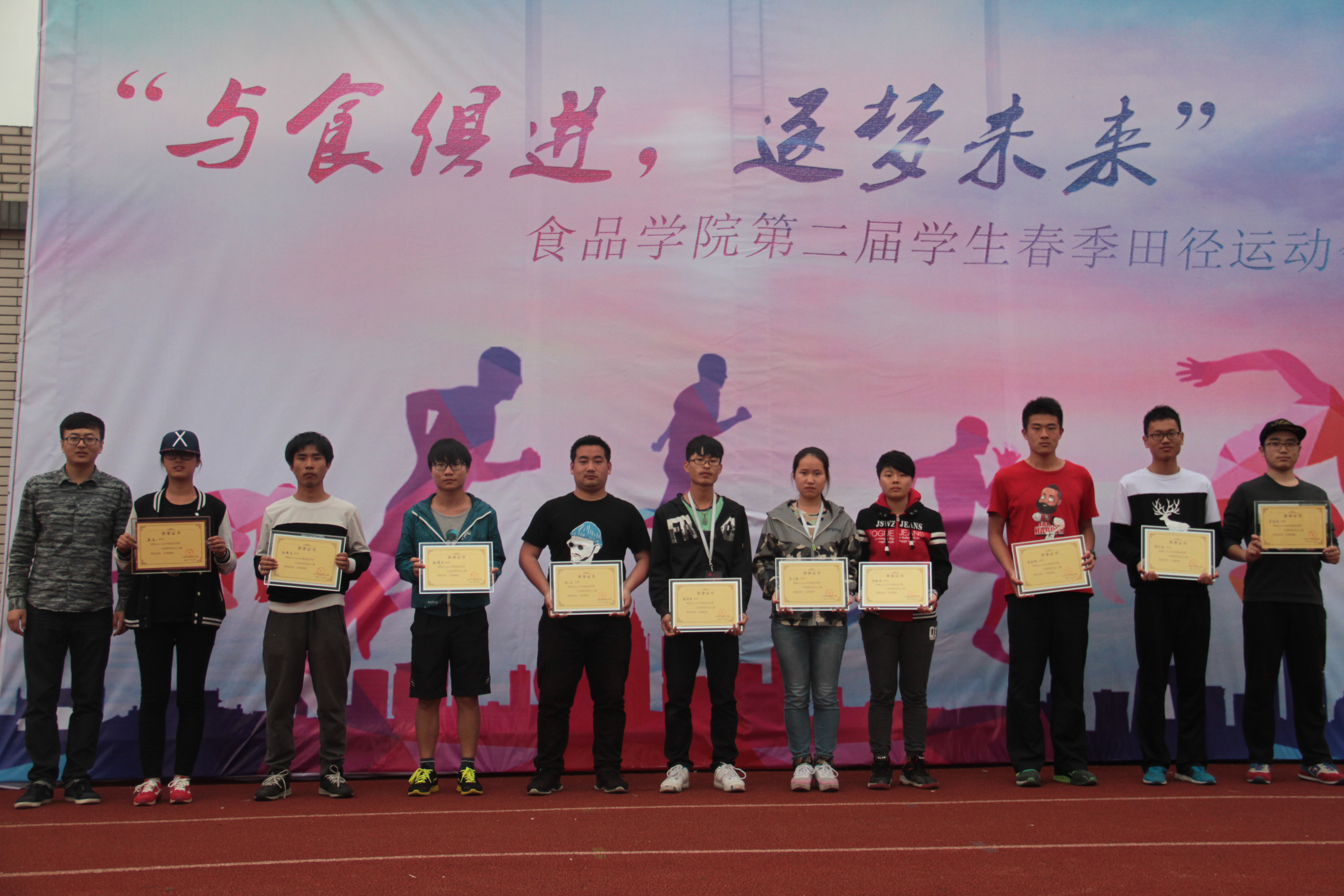 本次比赛包括男女100米、200米、400米、800米、1500米、4×100米接力、跳高、跳远、铅球共9个田径项目。此外,还增设了袋鼠跳接力、三人四足、背夹球竞速、团队跳绳、旋风跑共5个大众项目,为运动会增添了趣味性。本次运动会共有200余名食品学子以纵队形式参加了比赛。即便烈阳如火,也丝毫不见退缩;即便对手强于我,必胜的信念仍存!快,再快!高,更高!每一次的超越,都诠释了运动员们不服输的精神;每一次的呐喊,都传递了观众们不言放弃的鼓励!下午4:30,随着最后一项大众项目袋鼠跳接力的哨声响起,运动会接近尾声。