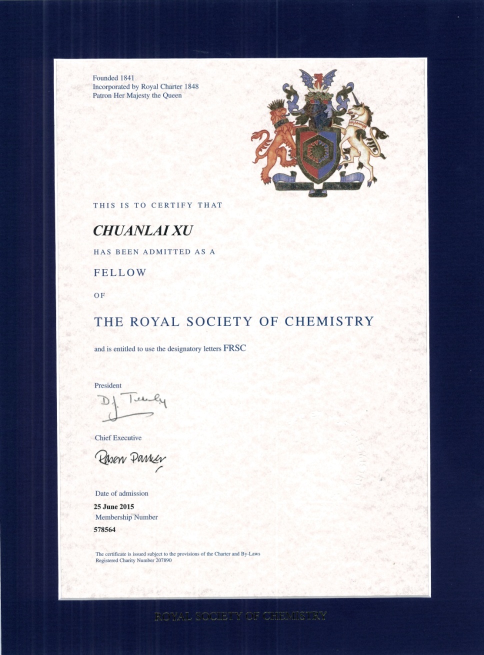 英国皇家化学会成立于1841年,是世界上历史最悠久的化学学术团体和欧洲最大的化学科学团体,也是国际上最有影响力的国际权威学术机构之一,其会员来自世界上100多个国家。根据专家提名推荐,RSC每年遴选在化学科学研究领域取得突出成就并具有国际影响力的科学家为其会士。