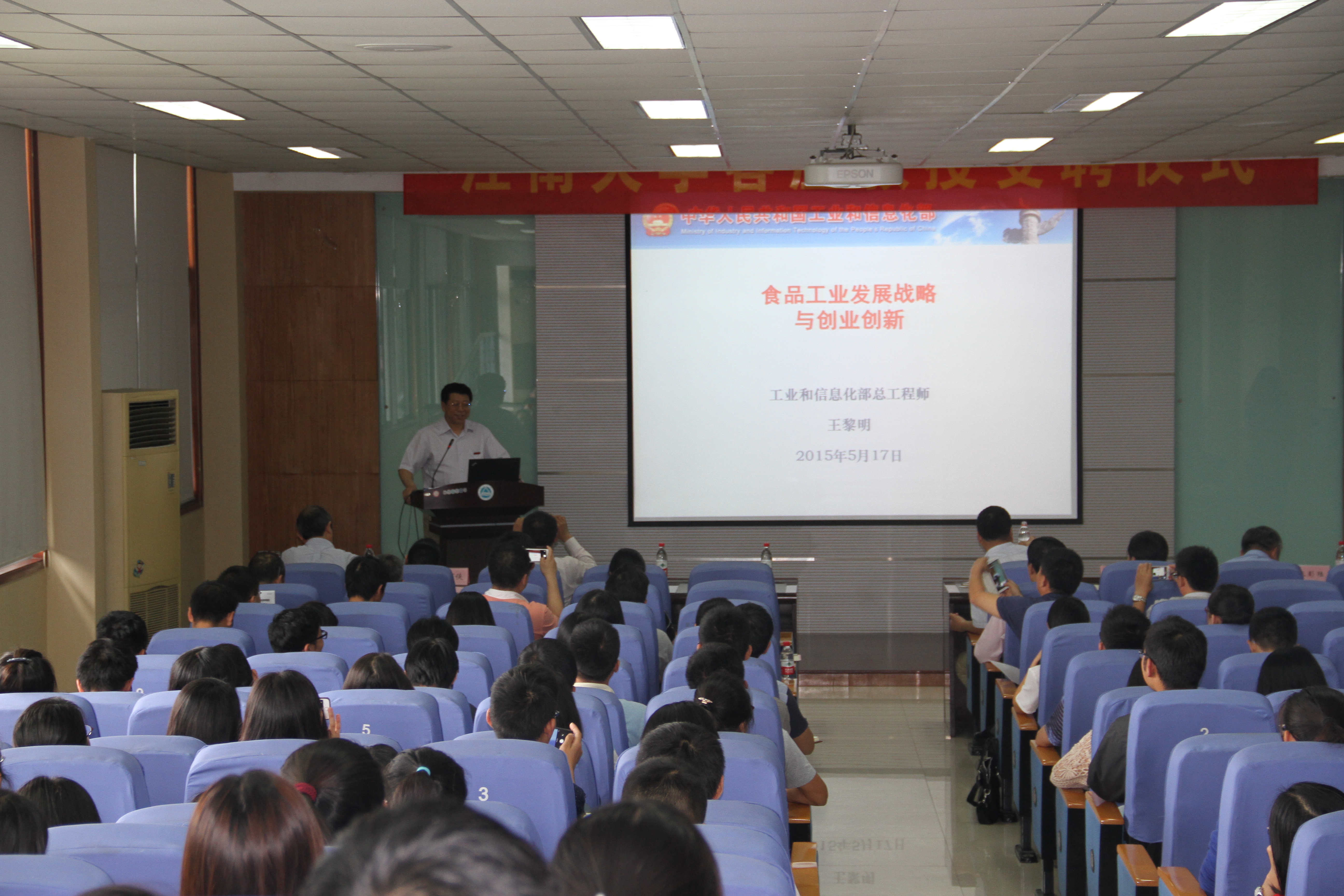 王黎明总工程师为1946伟德国际源自英国师生作题为“食品工业发展战略和创业创新”专题学术报告,报告会由副校长纪志成主持。将近两个小时的报告中,王总工程师理论联系实际,用精炼生动的语言和大量翔实数据案例高屋建瓴地分析了我国食品工业发展现状以及未来发展趋势,并对如何推动创业创新以及高校大学生如何开展创业创新提出深刻独到见解。他指出高校要把创业教育纳入到人才培养目标中。大学生就业创业首要前提是拥有良好素质,一是正直、正派,二是有思想,三是敬业态度,三者具备才能实现自我价值,才能成就事业。报告结束后,他还与在场师生进行交流互动,讲座在热烈掌声中圆满结束。此次高水平的学术报告会开阔了师生学术视野,取得良好效果。(1946伟德国际源自英国 文/图:李萍;审核:向琪)
