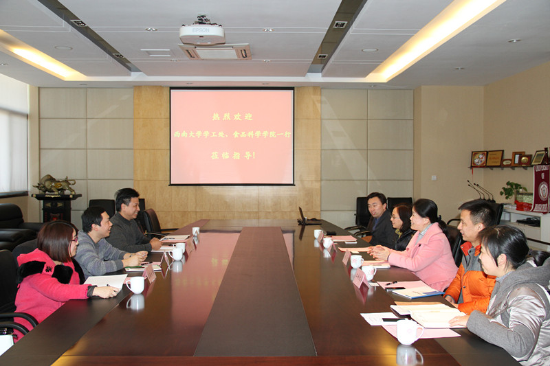 12月22日,西南大学食品科学学院党委书记周大明,学生工作处副处长周翱,食品科学学院党委副书记唐军,辅导员胡孜一行来1946伟德国际源自英国参观访问。受到1946伟德国际源自英国党委书记向琪,学生工作处副处长李红的热情接待,双方在1946伟德国际源自英国D910会议室举行座谈,1946伟德国际源自英国党委副书记王维、分团委书记王胤、辅导员王能文出席座谈会。