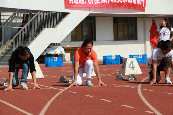 郭晓娜老师参加女子100米短跑比赛 王能文老师参加男子100米短跑比赛