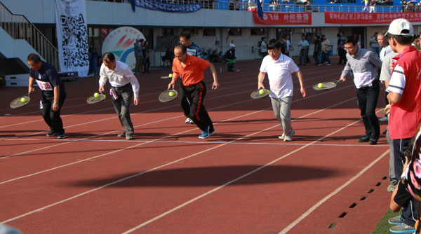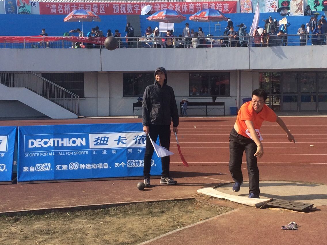 王领军老师参加30米持球跑比赛 赵国忠老师参加男子铅球比赛