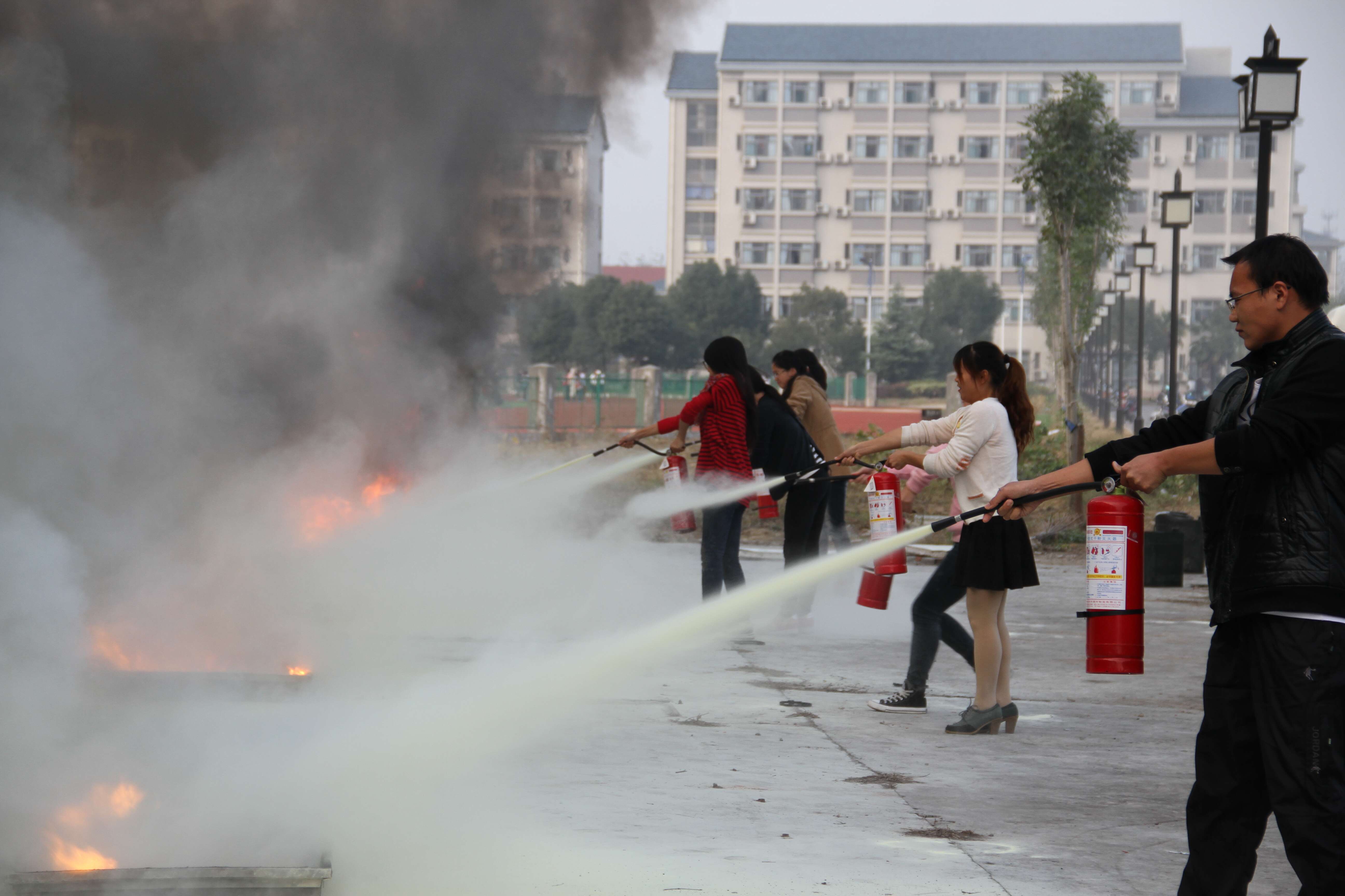 随后,在学校保卫处的安排和教官的专业指导下,师生们进行了户外消防灭火的实战演练。通过消防演习,师生进一步加深了解了火情的危害性,也掌握了灭火器的正确使用方法。