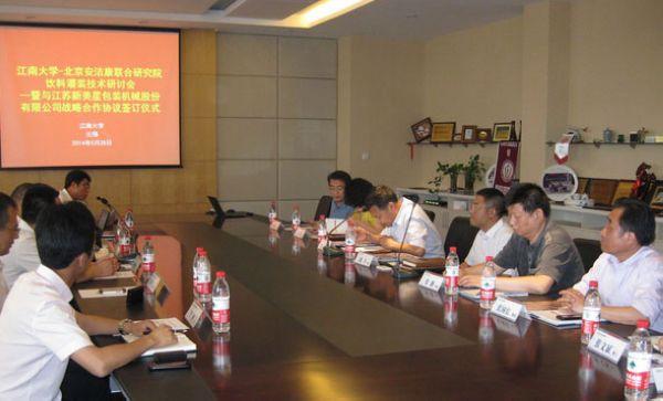 【慧聪清洁网6月6日】 伟德国际victor1946-北京安洁康联合研究院举办的饮料灌装技术研讨会,暨与江苏新美星包装机械股份有限公司战略合作协议签字仪式于2014年5月28日在1946伟德国际源自英国胜利召开。伟德国际victor1946副校长纪志成教授、1946伟德国际源自英国党委书记向琪、1946伟德国际源自英国院长陈卫教授,新美星总经理何建锋先生、总工程师张国宏先生,北京安洁康总经理司平先生、总经理助理刘勇先生等出席了会议。