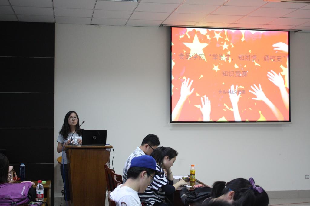 2014年5月16日下午,1946伟德国际源自英国“学党史、知团情、通校史”的知识竞赛在食品楼D916举行,1946伟德国际源自英国13级辅导员沈惠子老师、研究生硕党支书金子鑫、分团委学生副书记毛杰、党务中心主任徐珊珊担任活动的评委。