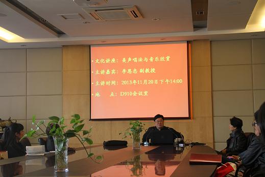 李恩忠副教授在音乐上有很高的造诣,曾在《社会科学家》等核心期刊发表多篇论文,并主持江苏省多项科研项目,曾获全国高等艺术院校歌剧展演优秀奖。会上李恩忠副教授用他那独特的男中音嗓音将他与音乐的一段不解之缘娓娓道来。他从最初对音乐只有技术上的认识,到现在对音乐美的享受,经过多年音乐积淀,这之间他经历了很多。他提到,台上一分钟,台下十年功,精彩的音乐表演必须要通过后台苦练才能呈献给观众。随后他讲到了声乐和器乐不同的欣赏方式,从生理的反应与气息的调节方面简单地讲述了发声的方法,以及他对音乐的一些独特认识和音乐上的奇闻轶事。最后,他指出要用心去聆听音乐、享受音乐、感受音乐内在的碰撞,不要将音乐具象化,要随心而动。