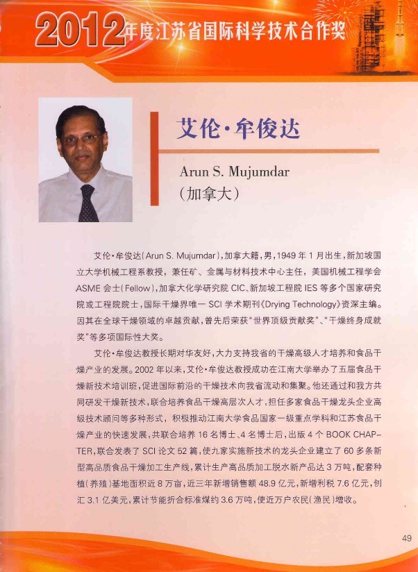 为了表彰全省科研人员做出的贡献,2012年度共评出省科学技术突出贡献奖2名,省国际科学技术合作奖4名;省科学技术一等奖17项;省科学技术二等奖60项;省科学技术三等奖122项;其中我校外聘博导、客座教授—艾伦.牟俊达(ArunS.Mujumdar)教授作为唯一江苏省高校推荐的获奖人,荣获了首届省国际科学技术合作奖,并受到了江苏省政府的隆重表彰。