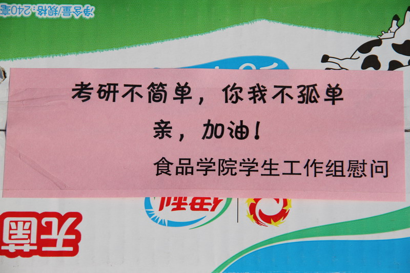 随着2013年研究生入学考试日期的临近,为了更好地关心和鼓励考研学生,帮助他们进一步调整考试状态,12月19日中午,我院党委副书记、副院长王维老师及各年级辅导员老师携牛奶、水杯等慰问物资来到学生宿舍,亲切慰问了我院正在准备考研的学子,为他们在寒冷的冬日中送来一份温暖。