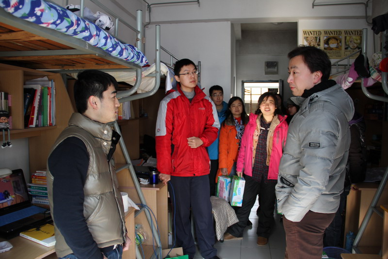 走进宿舍,虽时值中午,但同学们都在认真备考,或整理笔记,或在做模拟练习题。当得知学院领导、老师来看望他们时,同学们纷纷欢迎并表示十分感动。王维老师表示学院一直非常关心全体考研学生,尽可能从各方面给大家提供良好的备考环境,希望大家一方面要珍惜时间,把握机会,另一方面也要注意劳逸结合,保持良好心态和学习节奏,力争实现自己的考研梦想。聊天期间,各位老师细心地向学生询问每个人的考研方向,并提出了一些调整考前生理与心理状态的建议。老师们一句句暖人心脾的问候、一声声鼓舞斗志的话语使同学们深受感动,他们纷纷表示,一定努力发挥,考出好成绩,不辜负学院领导和老师们的殷切期望。老师们也表示,希望考取本校研究生的学生能够取得好成绩,再一次成为我院的新生。