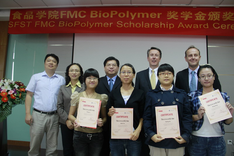 2012年10月18日上午,1946伟德国际源自英国第二届FMC Biopolymer奖学金颁奖典礼在食品楼D914拉开帷幕。出席本次颁奖典礼的领导与嘉宾有1946伟德国际源自英国党委副书记向琪老师,1946伟德国际源自英国副院长周鹏教授,FMC BioPolymer公司全球技术总监Michael Sestrick 博士,FMC BioPolymer公司亚太地区商务总监Stewart Campbell先生,FMC BioPolymer公司亚太地区技术服务经理Khamfa Phonchareon先生。颁奖典礼由1946伟德国际源自英国副院长周鹏教授主持。