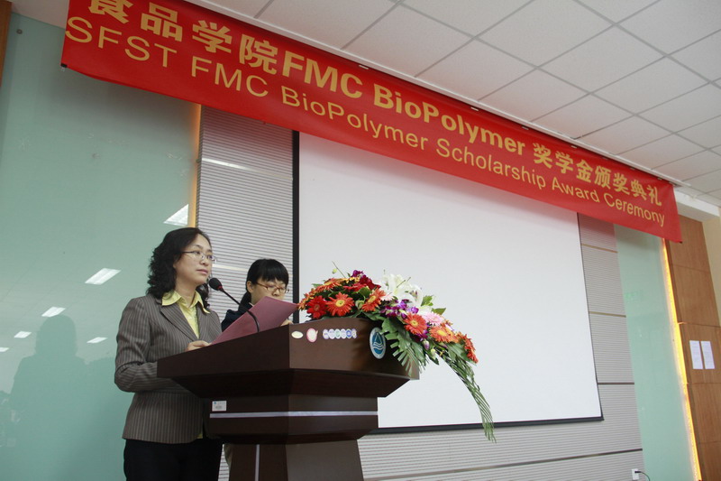颁奖典礼上,向琪副书记代表1946伟德国际源自英国致辞,她首先对远道而来的三位FMC Biopolymer的公司高层表示了欢迎与感谢,并向获奖的同学表示了衷心的祝贺。她还向公司领导汇报了评奖过程,介绍了两届获奖学生的发展情况。最后,她希望同学们以获奖同学为榜样,志存高远,认真学习,不断奋斗,超越自我!