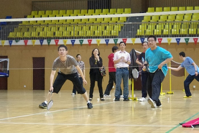 比赛进行了简短的开赛仪式,在宣布了本次比赛的规则及赛制,所有参赛队员合影留念,以及简单热身后,首先进行的是1对1对抗赛。随着裁判的一声哨响,比赛在五个场地同时展开!只见赛场上空掠过一只只羽毛球,伴随着一次次凶狠的扣杀飞旋而来,面对老师们的强烈攻势,学生们毫不示弱,有条不紊地进攻使比分一度胶着。经过21场对决,学生代表队以13:8胜出。