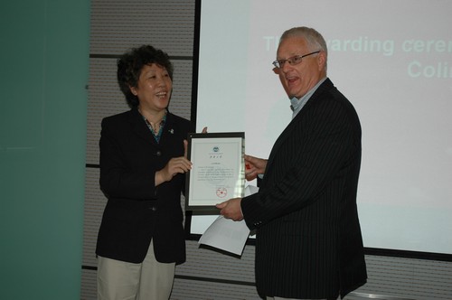 王武副校长随后为Colin.Ratledge教授授予客座教授聘书并佩戴伟德国际victor1946校徽,Colin.Ratledge教授与王武副校长握手并合影留念。