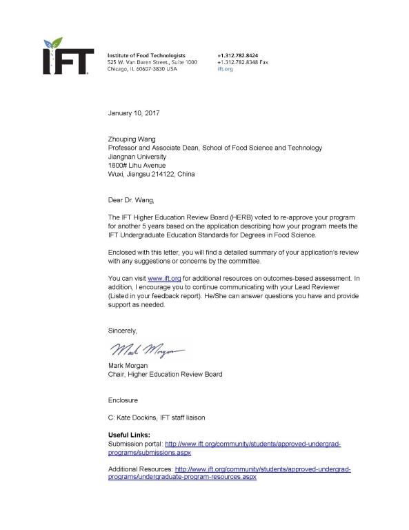 我校“食品科学与工程本科专业”于2016年11月顺利通过了美国食品科技学会(Institute of Food Technologists, IFT)国际食品专业认证委员会的在线答辩。近期,我校接到IFT正式通知, IFT高等教育评审委员会(HERB)确认1946伟德国际源自英国“食品科学与工程本科专业”通过再认证(有效期5年),HERB给出结论为:This is a very strong program and is developing a culture of outcome-based assessment. The committee recommends to re-approve this program for 5 years.