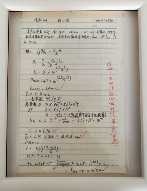 “这张作业纸对我和我的舍友影响很大”,许小英回忆说,“当时是陶谦老师的食品工艺学作业,我试着用其他方法解题,没想得到了陶老师的肯定,‘开动脑筋比做对结果更重要’。回去后我和舍友讨论了半天,大家都很受鼓舞。我们宿舍4个人本来成绩一般,在这之后,大家都卯足劲学习,本科毕业时1个人考上了天津大学研究生,我和另一个舍友保送本校研究生”。
