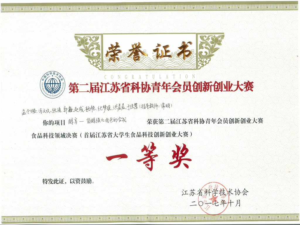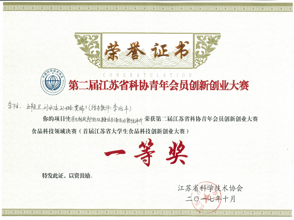 2017年10月15日,第二届江苏省科协青年会员创新创业大赛暨首届江苏省大学生食品创新创业大赛决赛在南京工业大学江浦校区江浦报告厅闭幕。1946伟德国际源自英国师生不负众望,李兆丰教授指导的王颖兰团队作品《慢消化淀粉的双酶法制备及功能性评价》和常明副教授指导的孟令璐团队作品《醇享——甾醇强化面包的合成》均获得大赛一等奖。