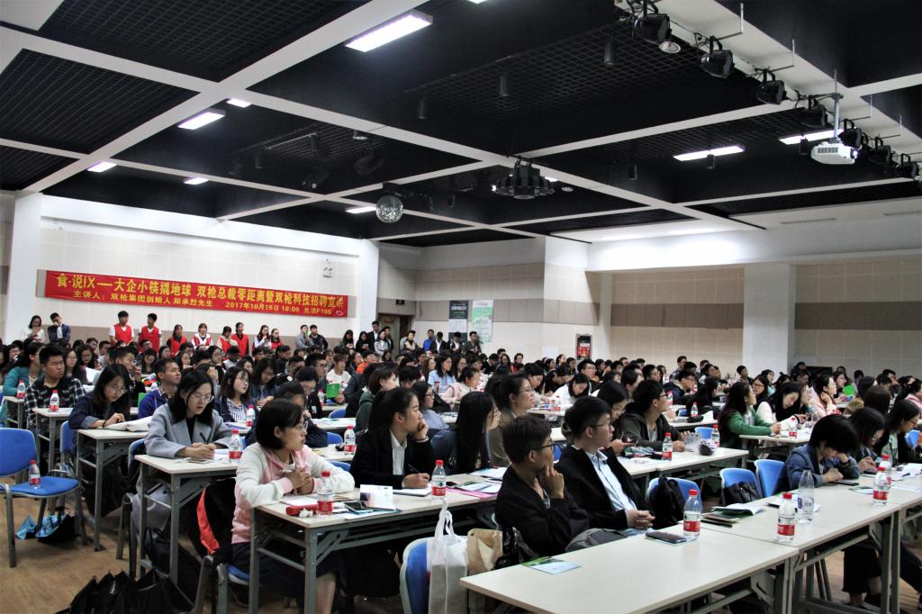 2017年10月15日晚六点,1946伟德国际源自英国就业创业中心在伟德国际victor1946北区大学生活动中心F105举办了双枪总裁零距离讲座暨双枪科技招聘宣讲会。本次到场的嘉宾有双枪竹木科技股份有限公司创始人、董事长兼总裁郑承烈先生和伟德国际victor1946就业指导老师和两位就职于双枪科技的江南校友,300余人参加了此次活动。