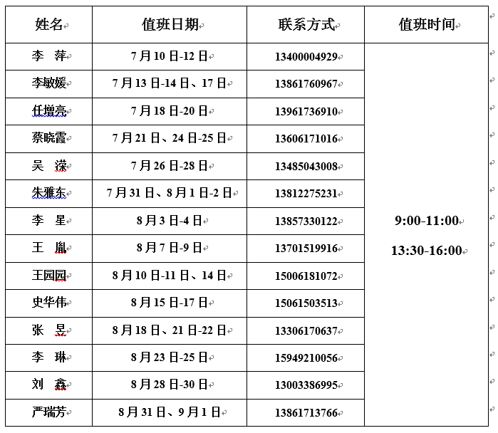 1.正常值班时间:上午9:00-11:00;下午13:30-16:00周六和周日不安排值班。