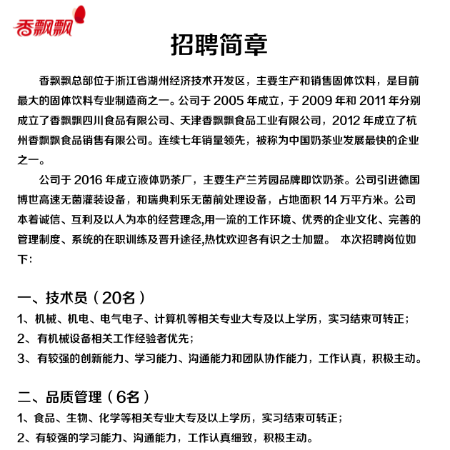 就业【2017】177号 香飘飘食品有限公司招聘简章