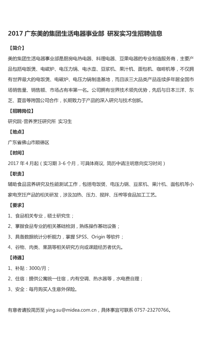 就业【2017】178号 广东美的集团生活电器事业部-研发实习生招聘简章