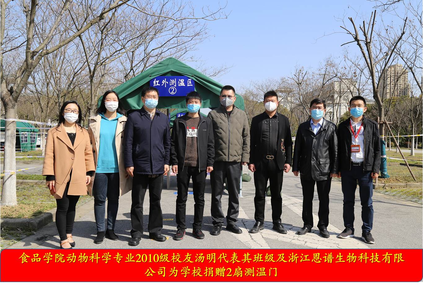 3月20日上午1946伟德国际源自英国校友汤明专程赶到学校,分别代表其作为法人的浙江恩谱生物科技有限公司和在校时的1946伟德国际源自英国动物科学专业2010级向学校捐赠了两套红外热成像人体测温门。田备副校长代表学校接受捐赠,社会资源处处长黄敏,1946伟德国际源自英国党委书记傅莉莉、院长刘元法等出席捐赠仪式。